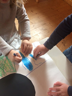 I stuck a black paper cave in the middle of a large paper sheet and divided the sheet into 5 sections with a pencil. As we read through the book during the activity, I asked the children if they could find other words  than "long" and "wavy" to talk about the grass for example. They came up with "green", "dark green" and "tickling". So I encouraged them to paint in the first corner of the page to represent the grass.